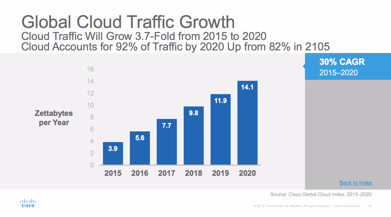 According to the Cisco Global Cloud Index, the amount of traffic running through cloud computing networks will increase to 14.1 zettabytes per year in 2020.
