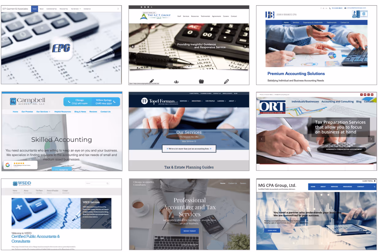 Why is it, then, that so many firms take similar approaches to their brand identities? Let me illustrate my point. Here are the homepages of nine Chicago accounting firms:
